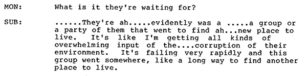 The rest of the CIA document (pp. 3-9) is a transcript of the remote viewer responding to questions about different locations and time periods given to him (in 1984, all known remote reviewers were men). The remote viewer is referred to as “SUB.,” while the questioner is “MON.”